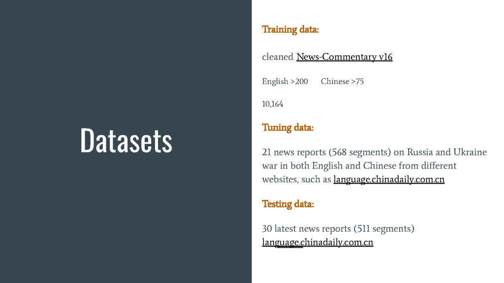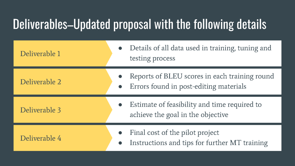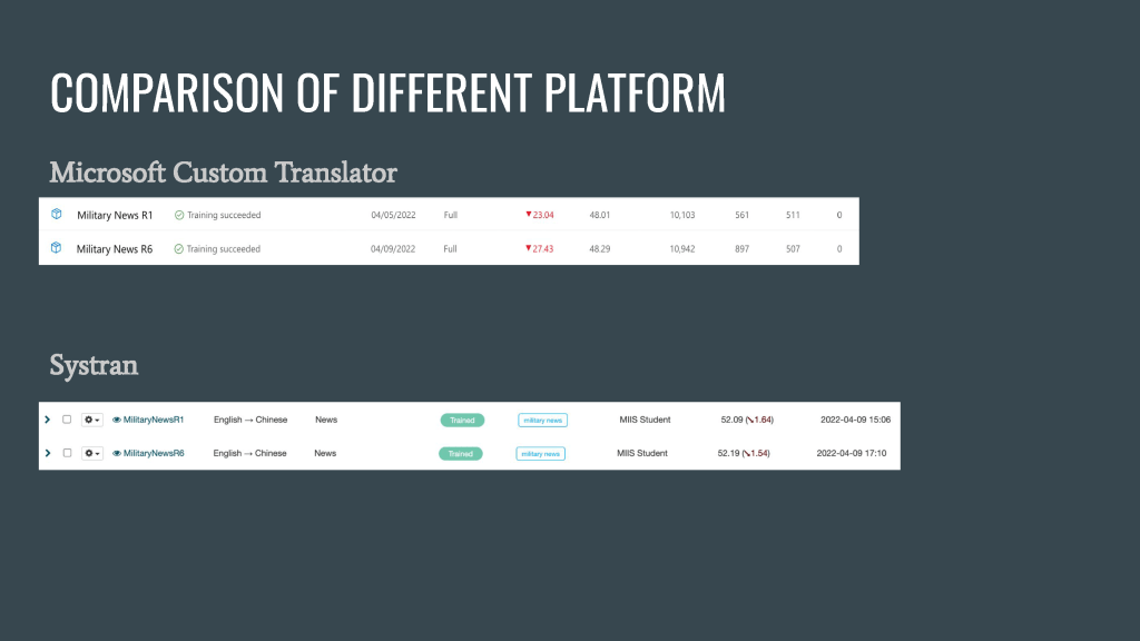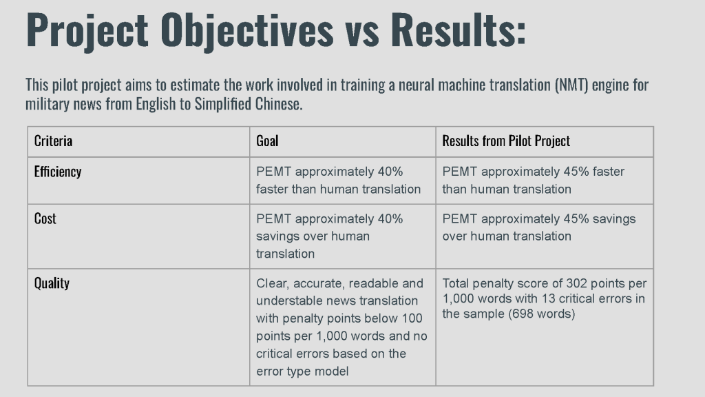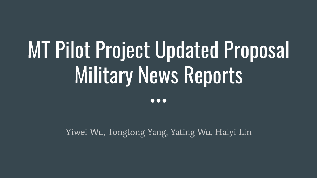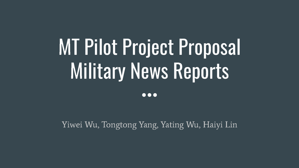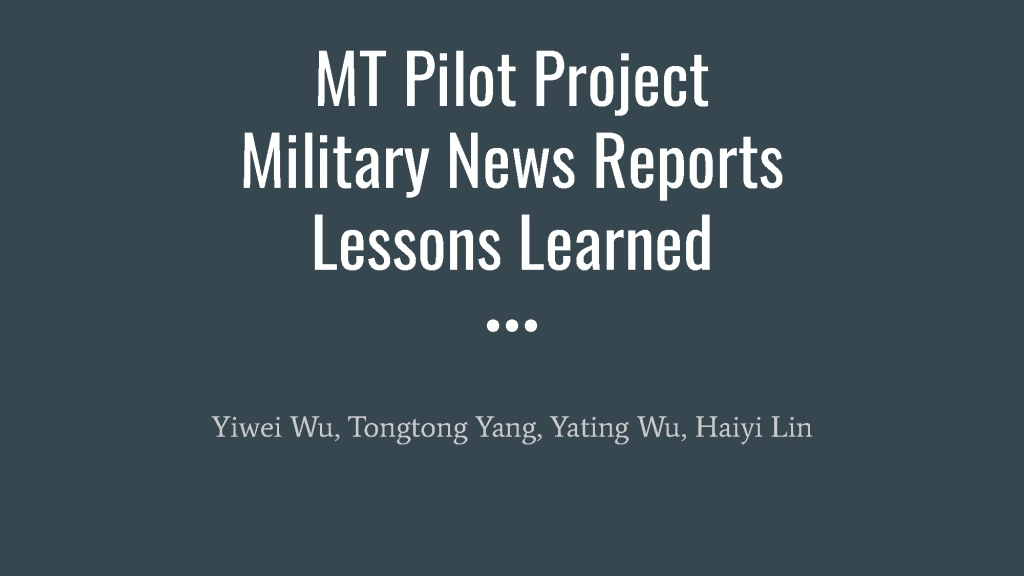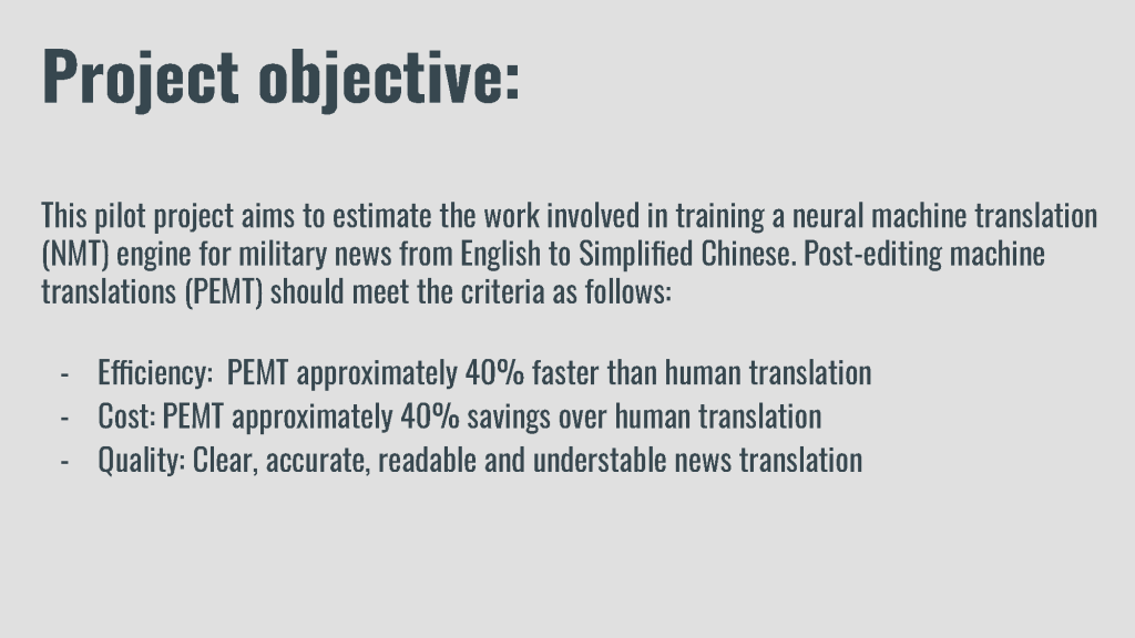 This pilot project aims to estimate the work involved in training a neural machine translation (NMT) engine for military news from English to Simplified Chinese.