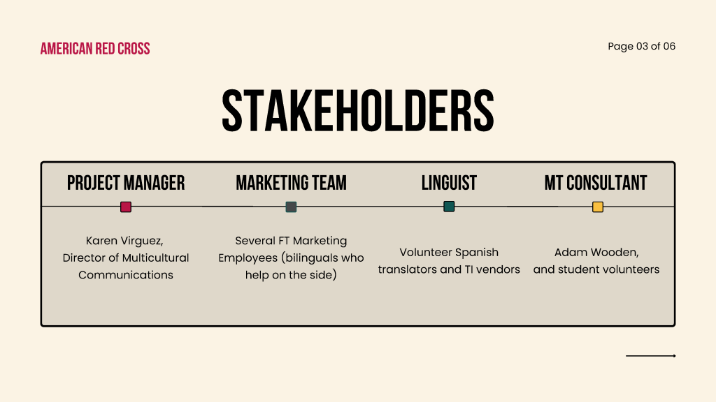 For our stakeholders, we have four sets. The first one is our project manager Karen. She’s the director of multicultural communications. The second one is our marketing team. We have several full-time marketing employees. All of them are bilingual and help on the site. The third one is our linguist. They are Spanish translator volunteers and TI vendors. The last one is the MT consultant, basically is Adam Wooden, and student volunteers.