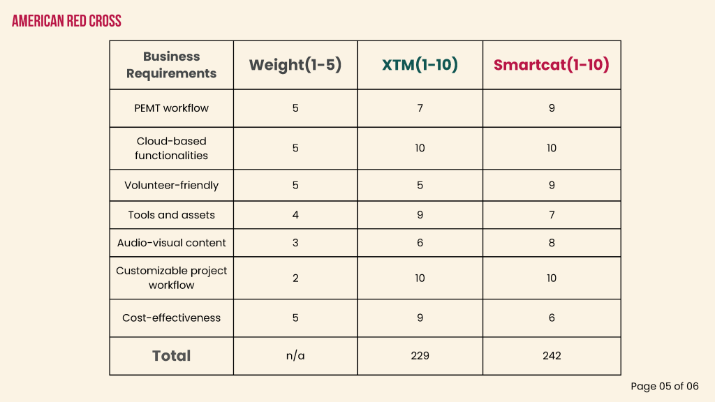 In total, XTM has 229 points and SmartCat achieved 242 points. Therefore, in conclusion, we think SmartCat would be a better option for American Red Cross as their TMX platform.