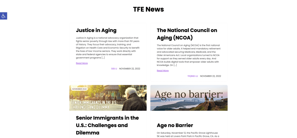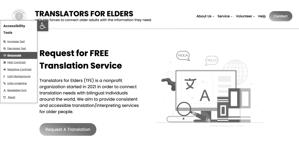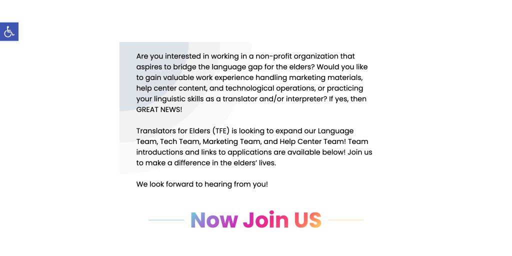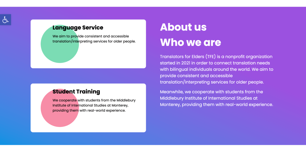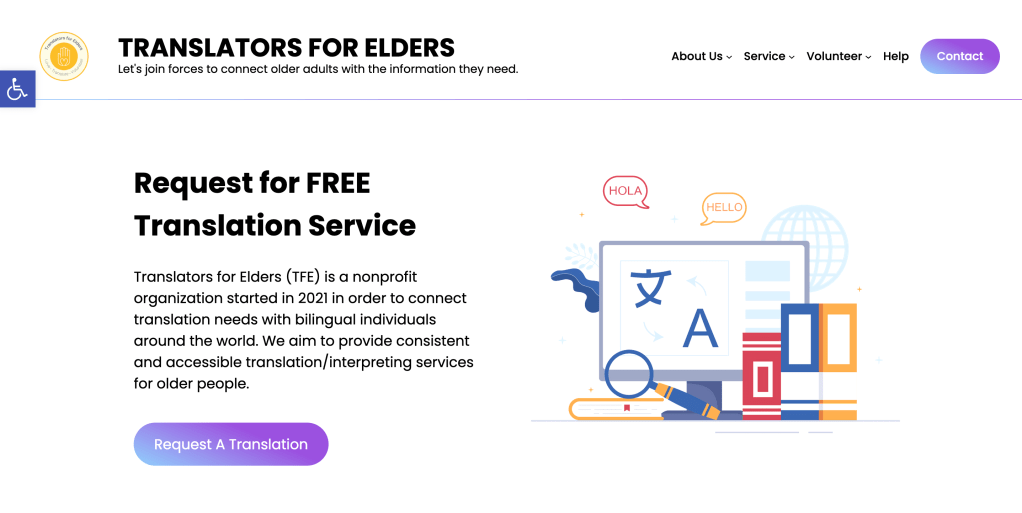 Translators for Elders (TFE) is a nonprofit organization started in 2021 in order to connect translation needs with bilingual individuals around the world who can donate their language skills and time. TFE coordinates translation from English into Chinese and Spanish using crowdin.com through communal volunteer support.