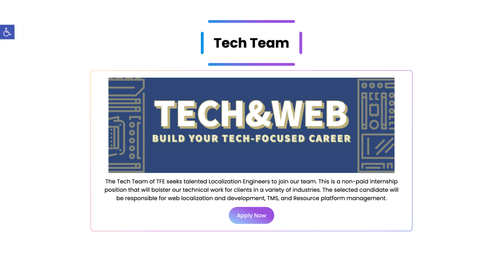 The reason why I work as the Head of Tech Team for Translation for Elders is that TFE offers a wide range of practice opportunities for me and website localization is a very popular field in the localization market. Therefore, I would like to enrich my knowledge and experience by participating in projects related to translation technology and website localization this semester.