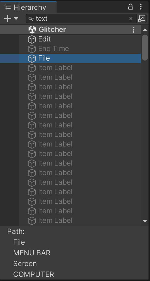 The way to find strings was pretty simple. We just needed to search “text” in Hierarchy, and almost all the properties with text would pops up.