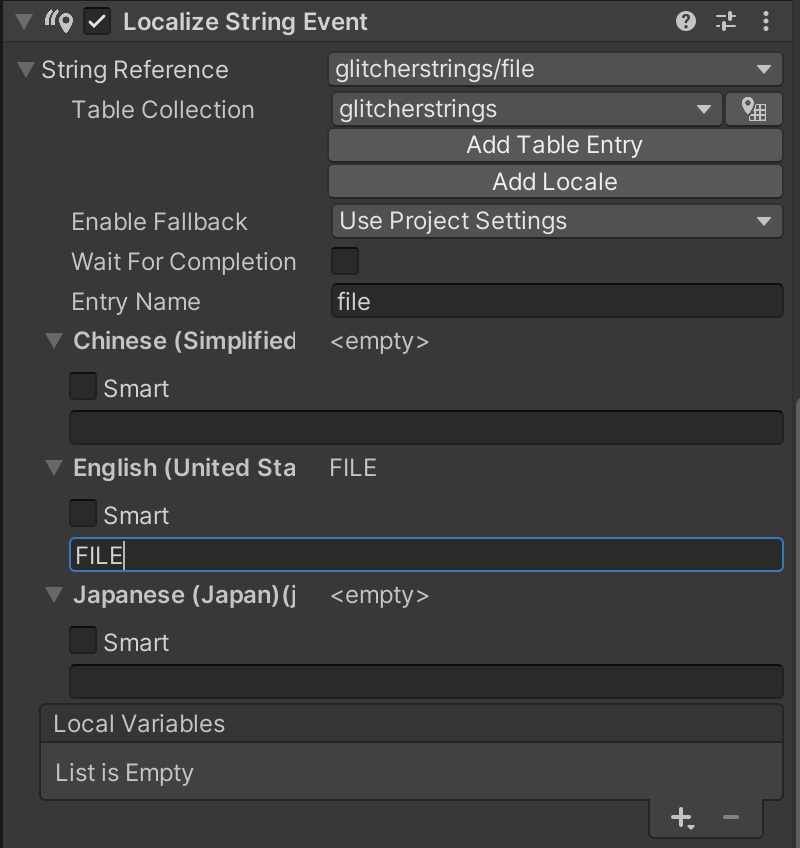 In the Inspector, we chose “Add Component”, and then selected “Localize String Event”. In the “Localize String Event” section of the Inspector, we can expand String Reference choose the string table that we created earlier. And then we can “Add Table Entry”. In “Entry Name,” we entered a key and expanded the locales. We put the original content the in English locales.